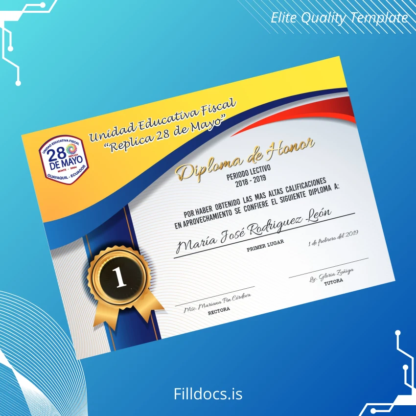 This template is a professionally designed honor diploma replica tailored specifically for Ecuador Unidad Educativa Fiscal _Replica 28 de Mayo_, offered in both Word and PDF formats. It serves as a blank diploma form enabling precise customization for educators, administrators, and individuals who require a formal, visually appealing certification document.