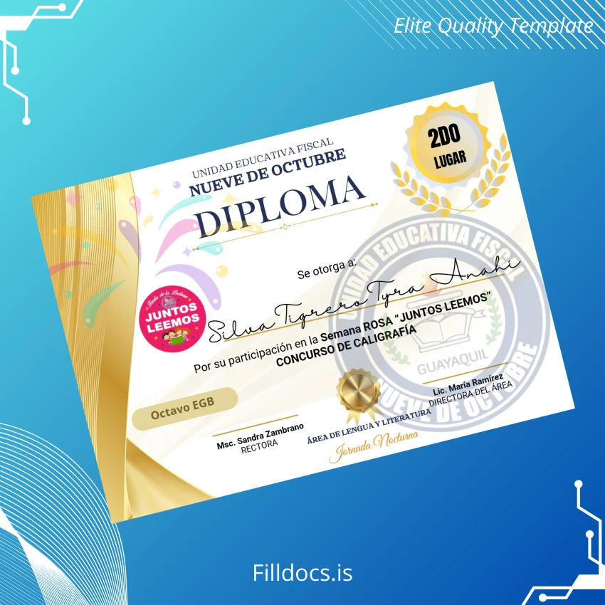 The Ecuador Unidad Educativa Fiscal Nueve de Octubre Diploma in Calligraphy Template – Word/PDF is a meticulously designed, fillable certificate template ideal for educational organizations and professionals seeking a customizable degree solution. This high-quality diploma template is crafted with attention to detail, featuring elegant calligraphy to convey prestige and accomplishment in a professional presentation format. It offers a seamless way to produce official-looking diplomas that can be personalized to meet specific institutional or individual needs.