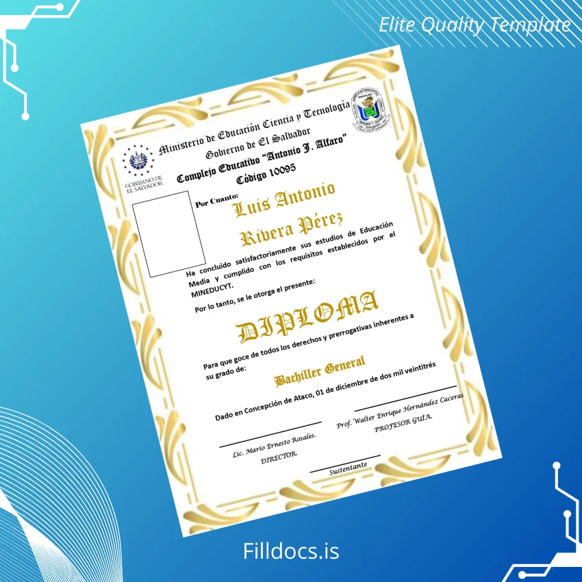 Discover the El Salvador Complejo Educativo Antonio J. Alfaro High School Diploma Template – Word/PDF, a professional and fillable diploma certificate template designed to meet the needs of educators, alumni, administrators, and makers of official documents around the world. This customizable degree template is perfect for those seeking a polished and authentic look when replacing or recreating diplomas efficiently and accurately.