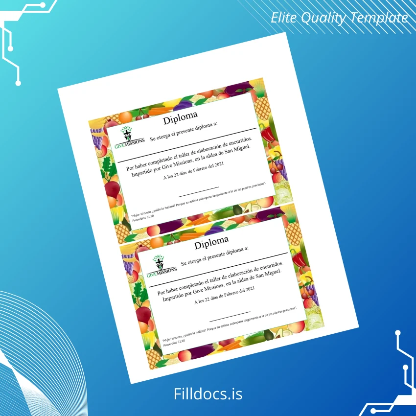 The El Salvador Give Missions Diploma Certificate in Pickling Workshop Template – Word/PDF is a professionally designed, fully editable document tailored for organizations and educators seeking a customized diploma format. This versatile template offers an ideal solution to swiftly generate formal certification documents with a polished and authentic appearance. Perfect for those who require a quick replacement diploma or a novel certificate design, this digital download streamlines your workflow while maintaining high aesthetic standards.