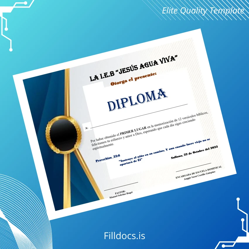 The El Salvador I.E.B. _Jesús Agua Viva_ Diploma Template – Word/PDF is a professionally designed, fillable diploma certificate template that combines traditional elegance with modern customization capabilities. Perfect for educational institutions or individuals in need of a customizable degree certificate, this template offers a seamless blend of style and functionality.