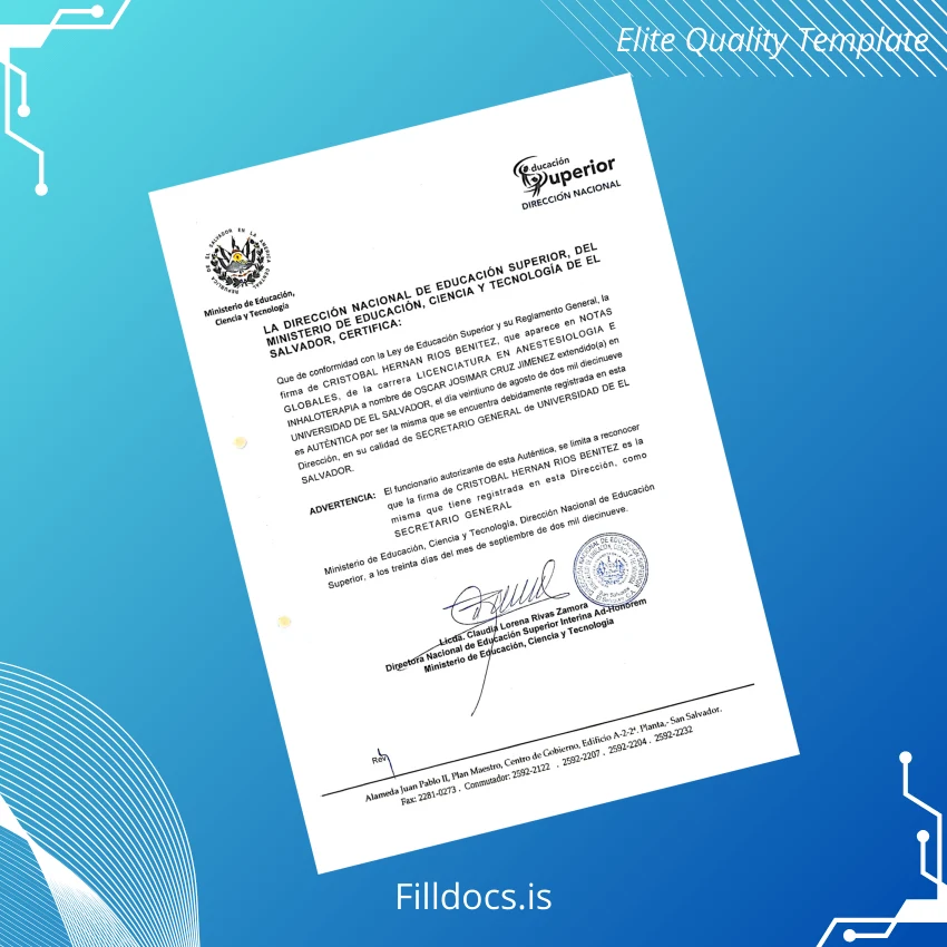 El Salvador University Bachelor’s Degree Anesthesiology Template – High-Resolution Word & PDF 3 Page