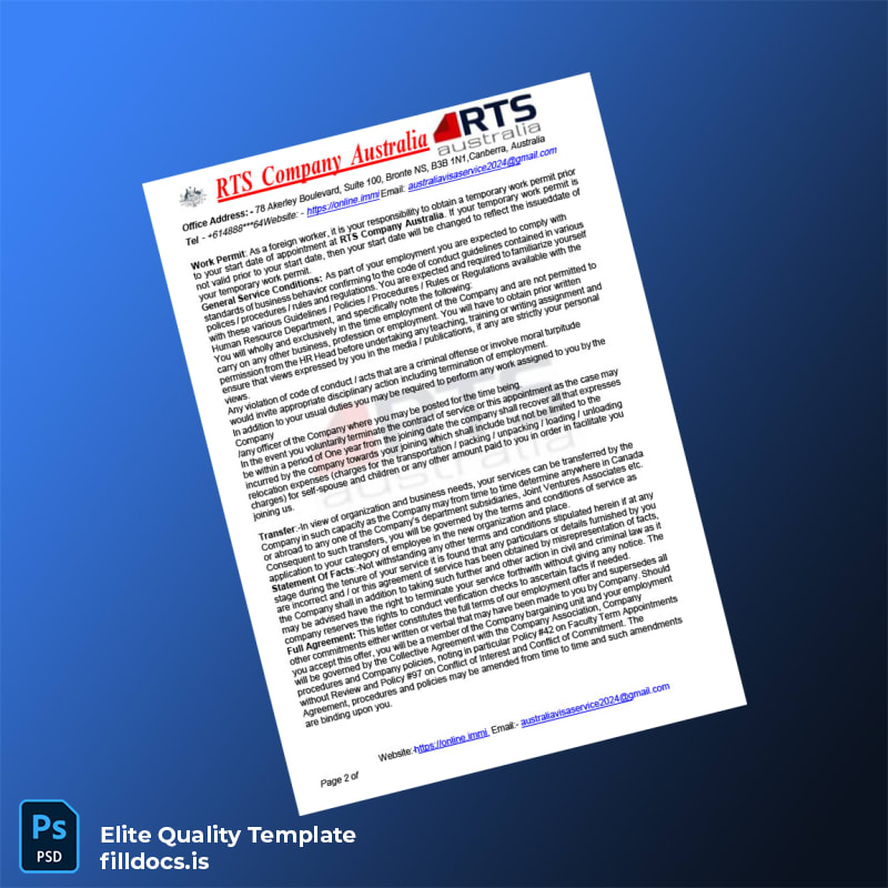 Upgrade your document management by securing this fillable Australia RTS Company Employment Verification Letter Word and PDF template. Confidently generate professional employment verification letters that meet your organizational standards and client expectations. Purchase and download today to ensure rapid, reliable employment verification whenever needed.