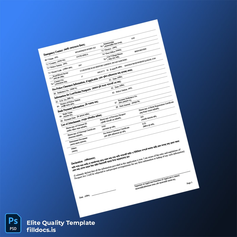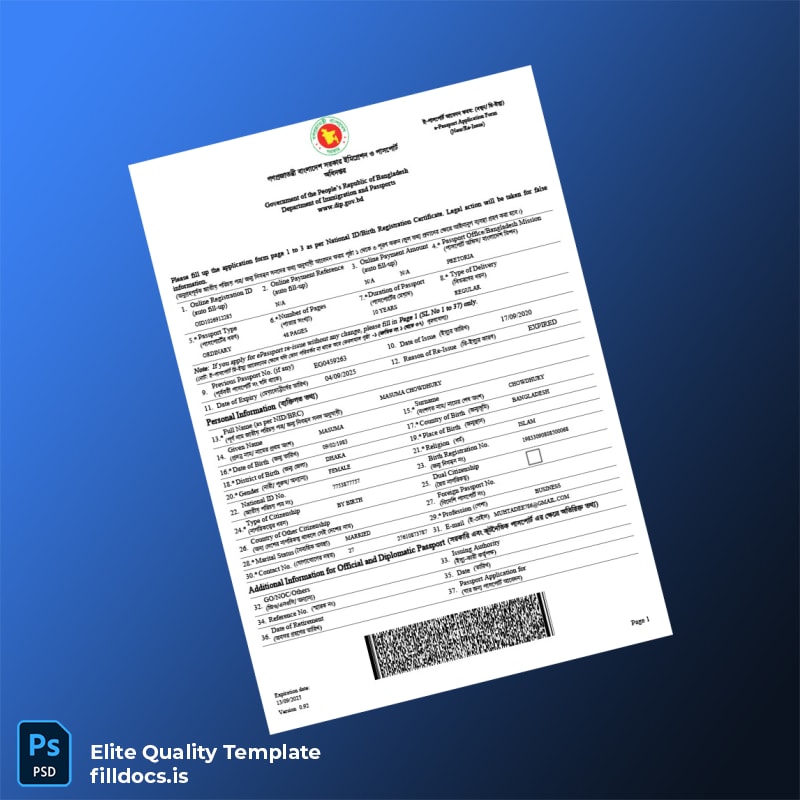 The Bangladesh Department of Immigration and Passports Registration Certificate Template in Word and PDF is a versatile and professional tool designed for business owners and professionals who need quick, easy, and accurate documentation. This fillable registration certificate allows users to efficiently update essential details such as company name, registration number, and address, eliminating the hassle of creating documents from scratch.