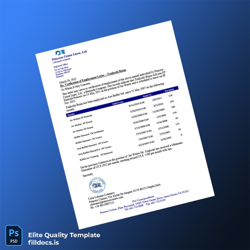 Fillable Bermuda Princess Cruise Lines Employment Verification Letter Template – Word/PDF
