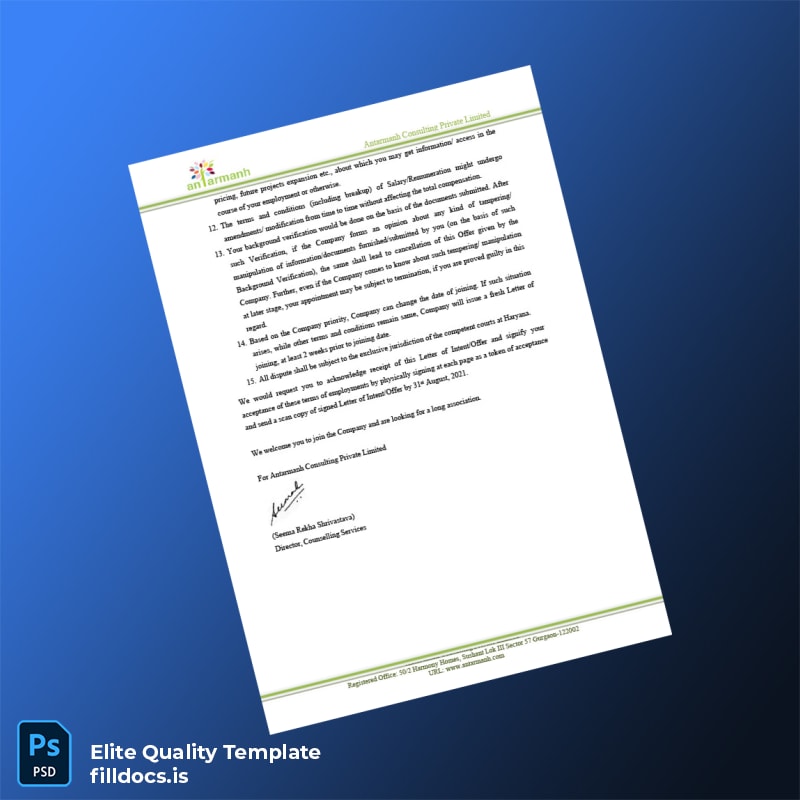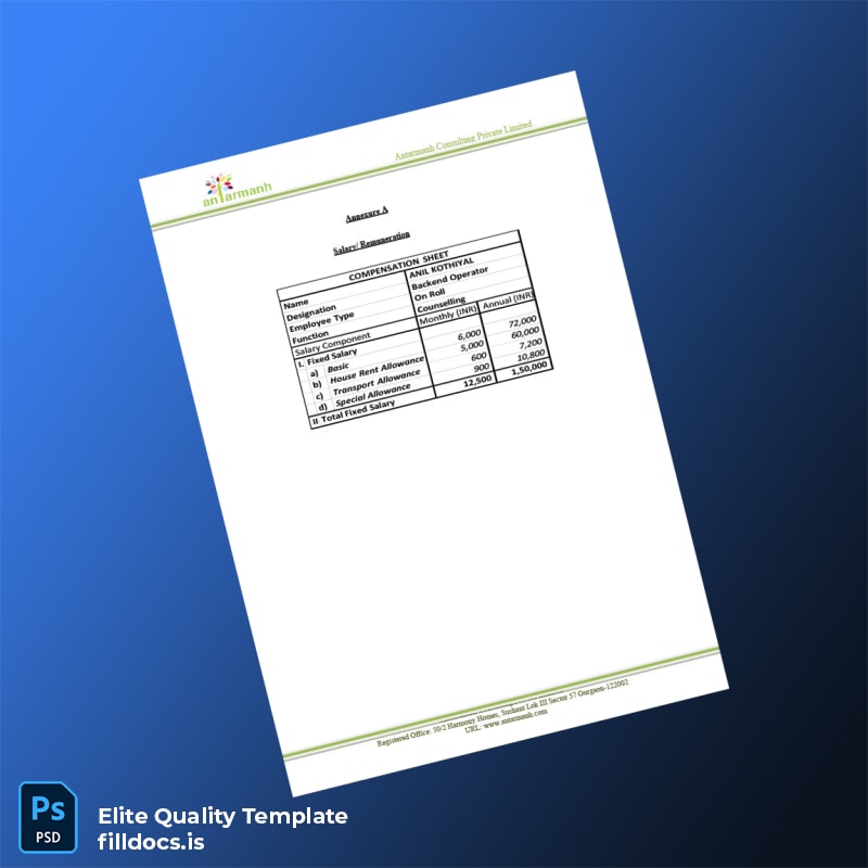 Ensure seamless job confirmation and salary verification using the Fillable India Antarmanh Consulting Private Limited Salary Certificate Template – Word/PDF. This editable template is designed for professionals who require a reliable, easy-to-customize certificate of employment document, perfect for submission to banks, government agencies, or potential employers.