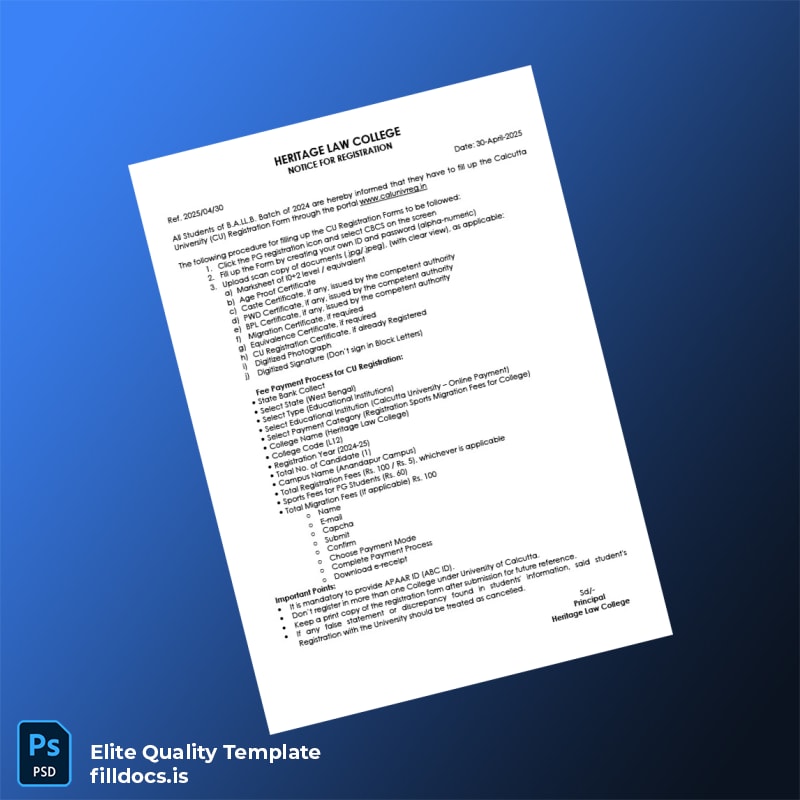 Experience seamless certificate generation and elevate your institution’s administrative efficiency. Purchase the Fillable India Heritage Law College Registration Certificate Template now for a reliable, easy-to-use, and professional solution that meets all your registration documentation needs.