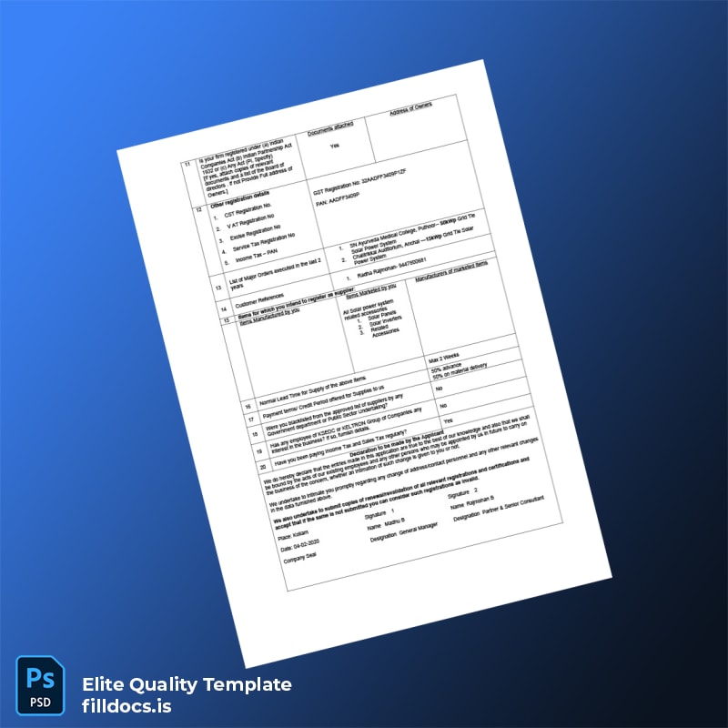 This fillable India Kerala State Electronics Development Corporation Ltd Vendor Registration Form Word and PDF Template offers a seamless solution for professionals seeking a readily adaptable, official registration certificate. Whether you’re an entrepreneur, vendor, or business administrator, this template is expertly designed to simplify the complex process of vendor registration while ensuring compliance and professionalism.