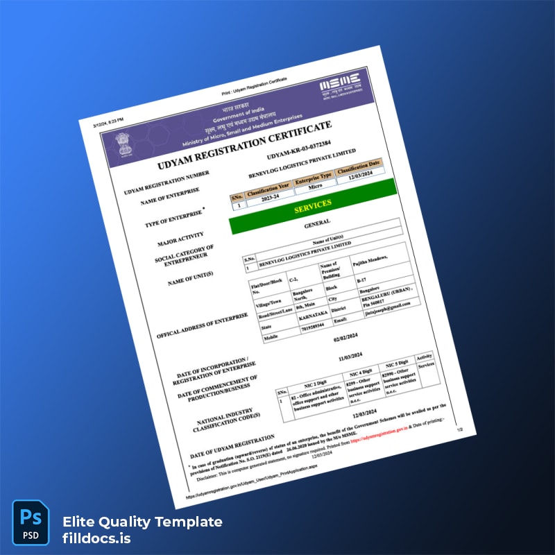 Streamline Your Business Compliance with the India UDYAM MSME Registration Certificate Template – Word/PDF