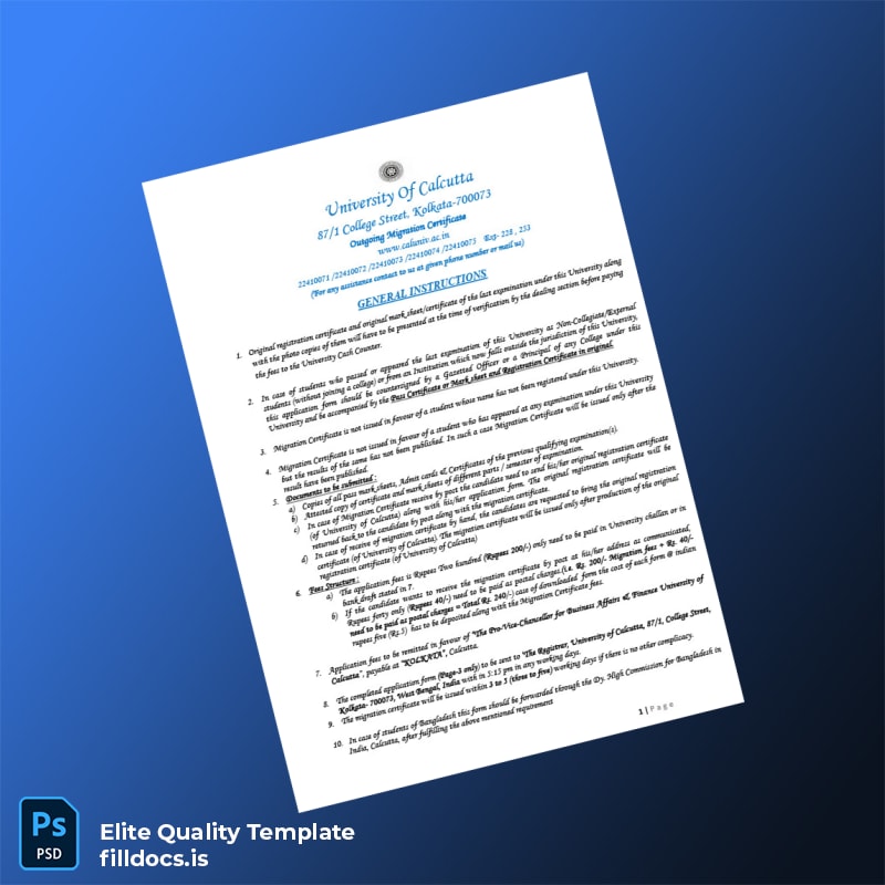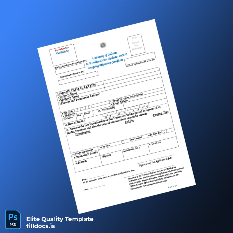 Fillable India University of Calcutta Migration Certificate Template – Word/PDF 3 page