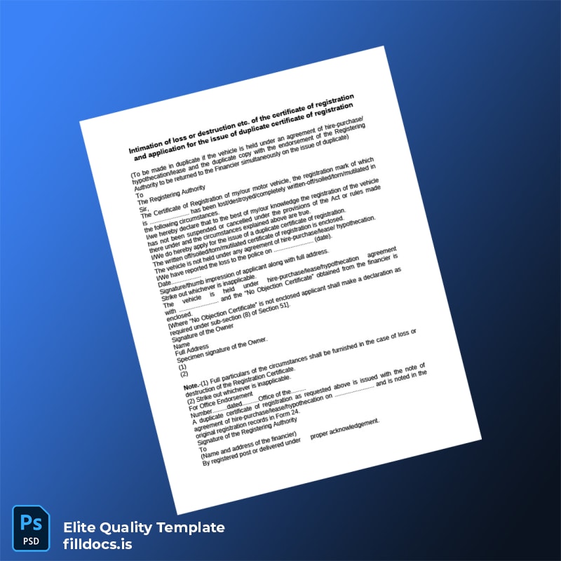 Handling the loss or destruction of essential business documents can be daunting. Our Fillable Intimation of Loss or Destruction of the Certificate of Registration and Application for the Issue of Duplicate Certificate of R Word and PDF Template offers a streamlined solution designed for companies and professionals who need to quickly and accurately replace vital registration certificates.