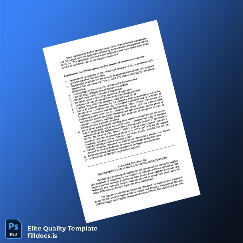 Managing business documentation can be time-consuming and stressful, especially when faced with the urgency of replacing or updating your registration certificate. Our Philippines DPWH Business Registration Certificate Template offers a seamless solution for professionals needing a reliable and editable document. This fillable template available in Word and PDF formats simplifies the process of obtaining your registration certificate with ease and precision.