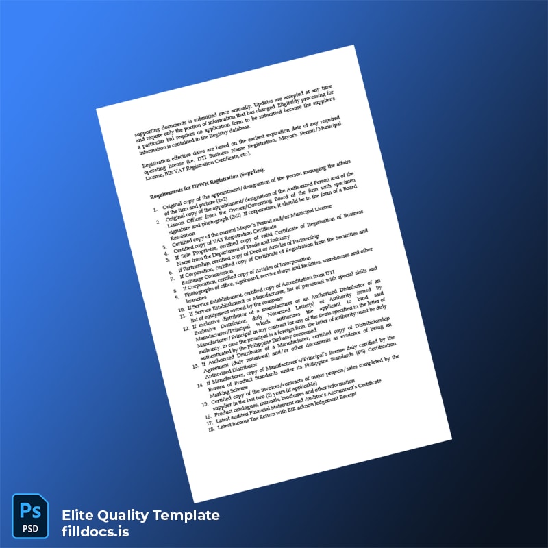 Imagine a business owner who lost their certificate or whose document expired unexpectedly. Accessing the editable registration certificate category at FillDocs allowed them to download this comprehensive company registration form PDF promptly, enabling swift updates without the usual bureaucratic delays. This template is tailored for entities requiring quick, professional, and accurate business registration documentation reflective of DPWH standards.