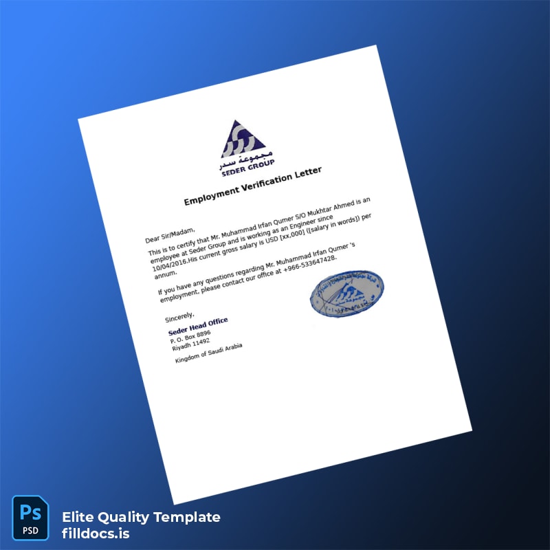 Don’t let employment verification become a hurdle. Acquire the fillable Saudi Arabia Seder Group Employment Verification Letter Template in Word and PDF today and experience a seamless, professional approach to confirming employment status. Click to download instantly and take control of your documentation needs.