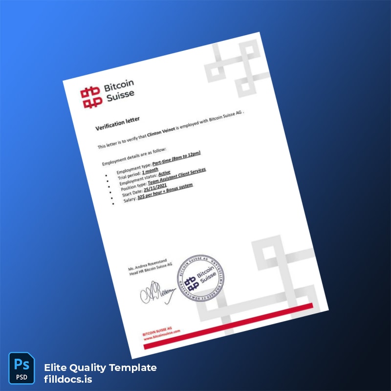 Don’t let employment verification slow down your operations. Download the Switzerland Bitcoin Suisse AG Employment Verification Letter Template today and experience a flawless blend of convenience, professionalism, and compliance in your employment documentation.