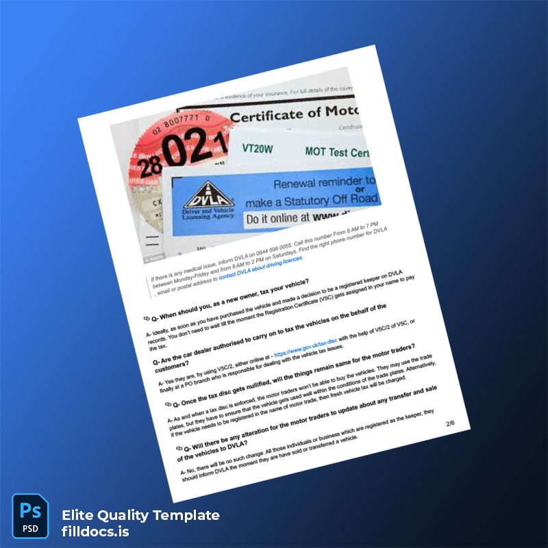 Don’t let vehicle registration paperwork slow down your operations or cause unnecessary stress. Download the fillable UK DVLA Vehicle Registration FAQs Document Template now and empower yourself with a reliable, professional-grade tool designed to meet the highest standards. Streamline your document management and focus on what truly matters – running your business efficiently.