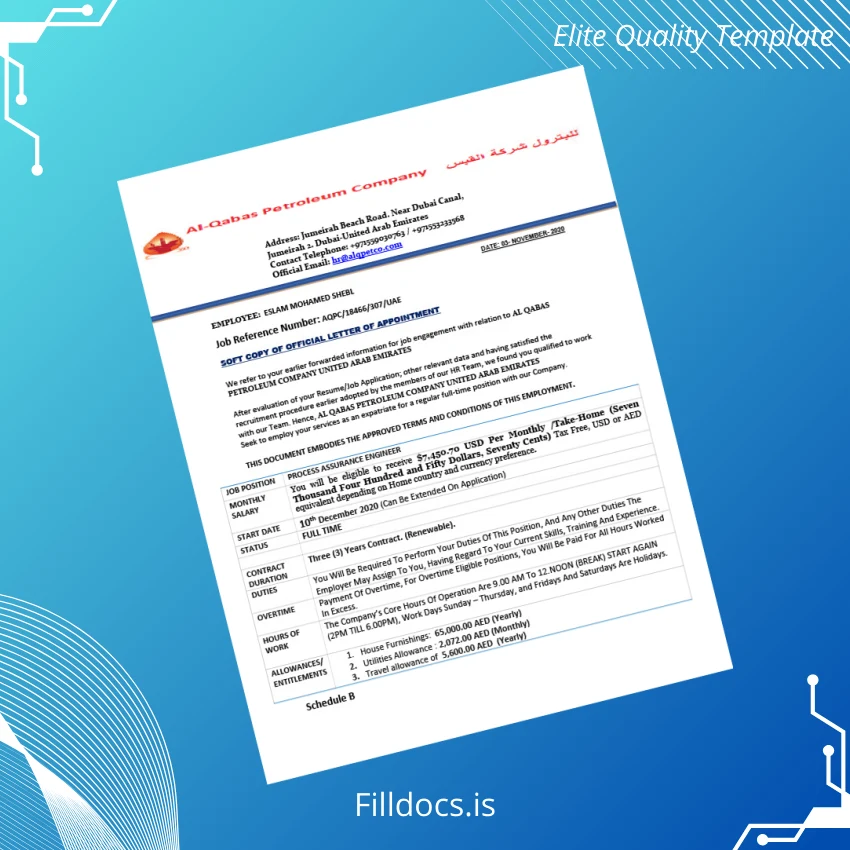 This template targets HR managers, recruiters, and administrative personnel who require a dependable and editable job confirmation letter template for employees of Al Qabas Petroleum Company. It addresses core issues such as tight deadlines, accuracy in employment data representation, and the need for a universally accepted document format. Whether replacing lost certificates or issuing supplemental proof of employment, this tool simplifies fulfillment of employment verification demands.