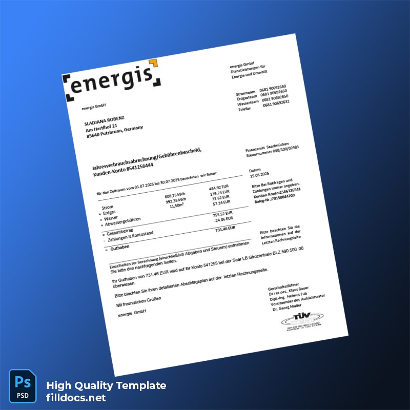 Germany Energis GmbH Utility Bill Template for Professionals