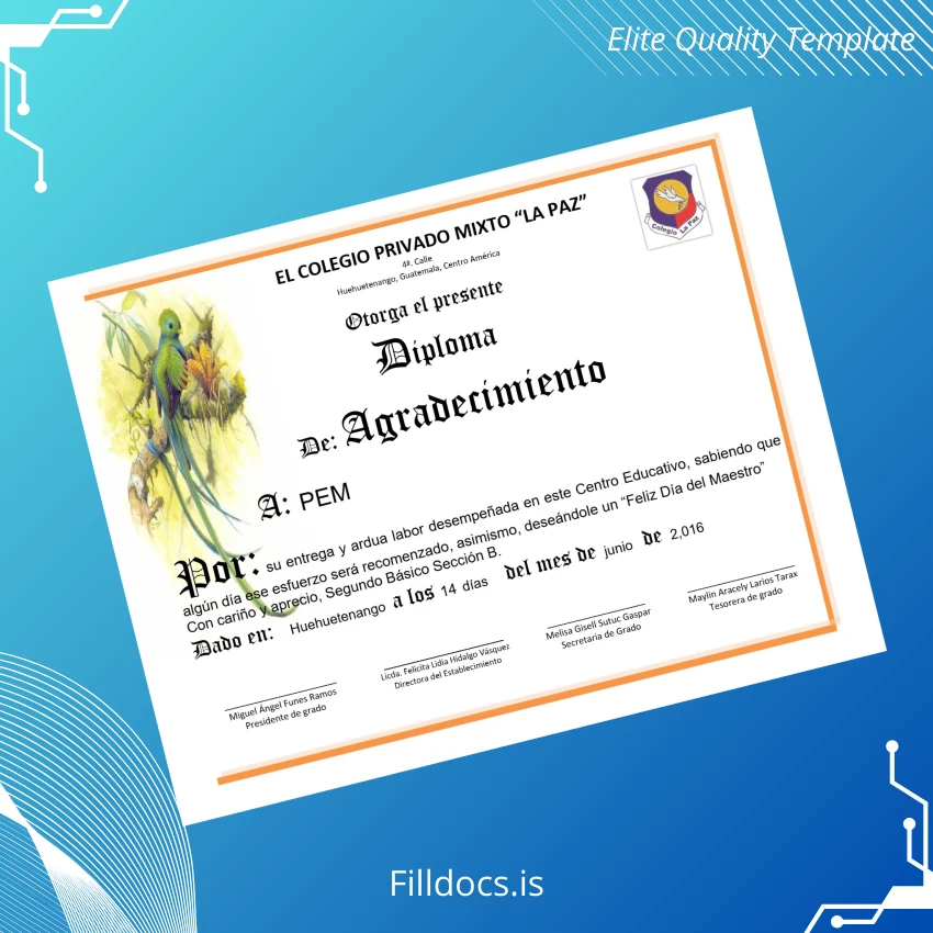 Discover the Guatemala Colegio Privado Mixto _La Paz_ Diploma of Appreciation Template – Word/PDF, a versatile and high-quality digital certificate designed for educational institutions and professionals seeking a customizable and professional diploma solution. This fillable template allows you to easily personalize every detail, including names, dates, and achievements, making it an ideal tool for awarding and recognition ceremonies.