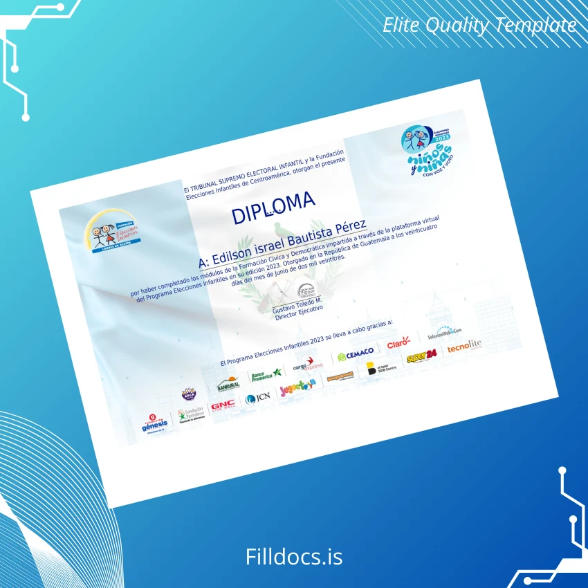 This diploma template is a digital file compatible with Word and PDF formats, crafted specifically for the Guatemala Fundación Elecciones Infantiles. It serves as a replacement diploma design that combines high-resolution graphics with a clean, blank diploma form layout, making it perfect for both official and novelty recognitions. Suitable for users needing a digital diploma download for immediate use, this resource offers a polished and professional finish.