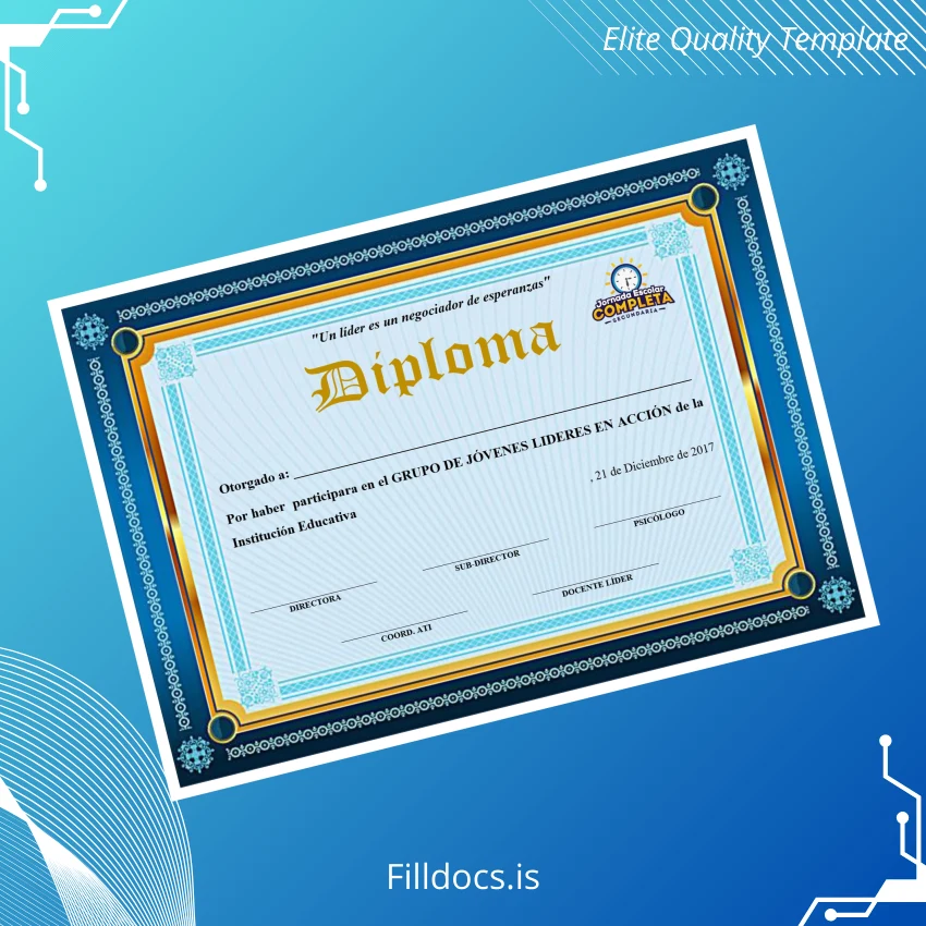 This editable diploma template is a blank diploma form designed specifically for the Guatemala Grupo Jóvenes Líderes High School. It features a clean and authentic design that can be personalized to match official standards. The template ensures that users obtain a visually accurate and prestigious diploma look suitable for official or keepsake purposes.