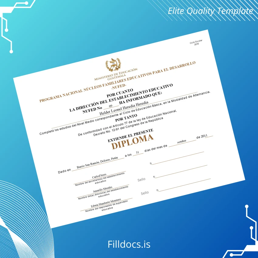 This template is a blank diploma form designed specifically for Guatemala NUFED High School diplomas. It serves as a novelty diploma design with high-quality, editable fields, offering a trustworthy and customizable degree template that meets professional standards. Ideal for producing replacement diplomas or official presentations, it combines authenticity with ease of customization.