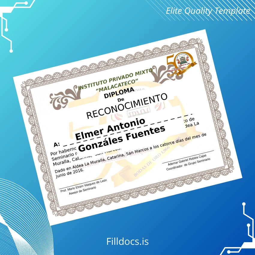 This Guatemala Private Institute _Malacateco_ Recognition Diploma Template – Word/PDF is a professionally crafted, editable certificate designed for seamless customization. Ideal for academic institutions, event organizers, and professionals needing a quick and reliable way to produce official-looking diplomas, this template combines ease of use with high-quality design features that ensure each document appears polished and authentic.