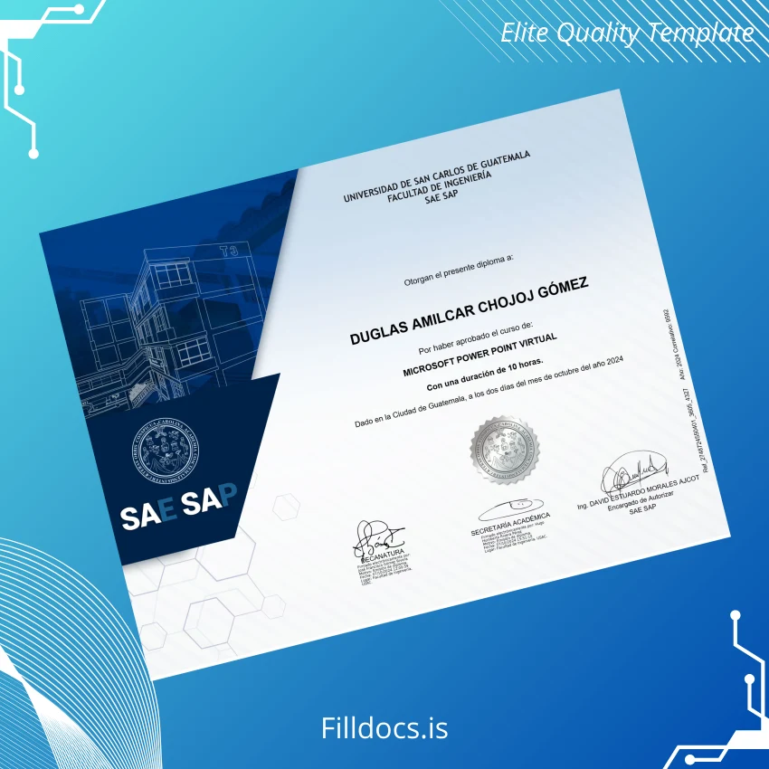 Discover the Guatemala Universidad de San Carlos de Guatemala Diploma in Microsoft Power Point Virtual Template – Word/PDF, a meticulously crafted digital certificate template designed for professionals who require a high-quality, editable diploma solution. This fillable template offers an ideal balance between aesthetic appeal and functional versatility, enabling you to customize and personalize diplomas with ease.