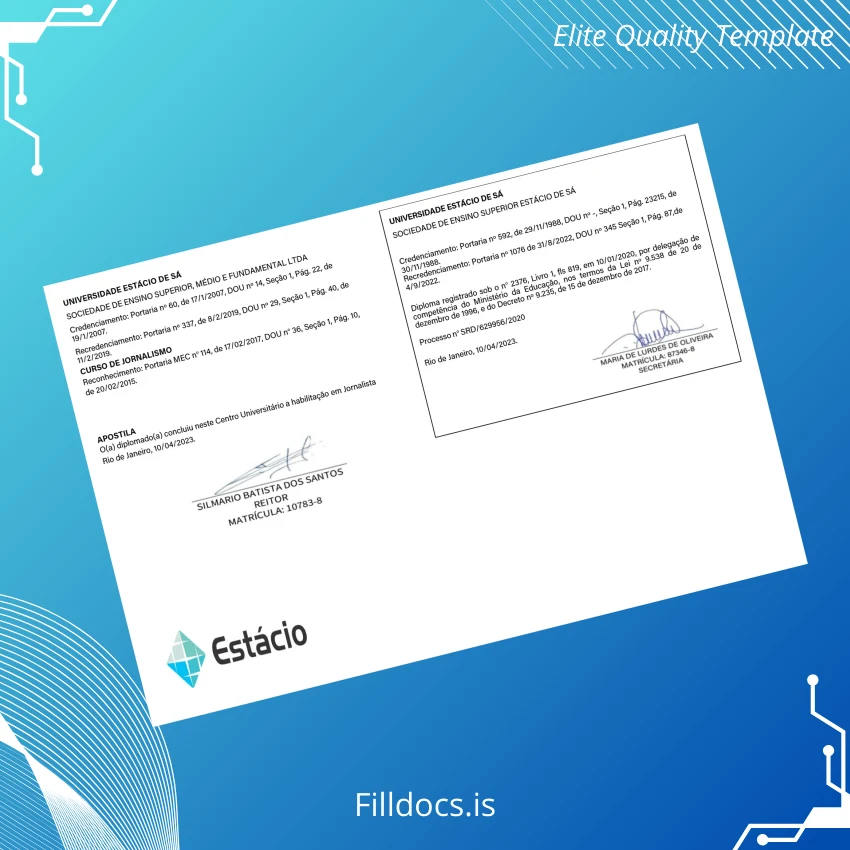 Discover the Brazil Estácio de Sá University Journalist Diploma Template – Word/PDF, a professional and customizable digital certificate designed for quick and easy editing. This fillable diploma form is perfect for professionals seeking a replacement diploma or a novelty diploma design that maintains authenticity and official style, catering specifically to graduates and those requiring a well-crafted document.