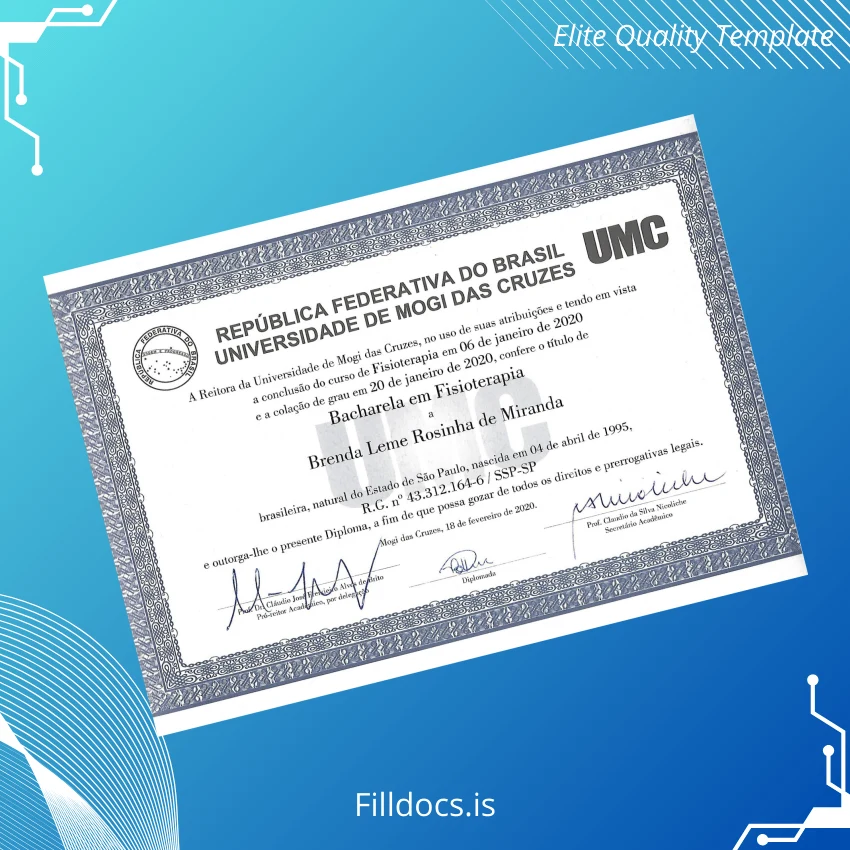 This fillable diploma form is a digital diploma download crafted specifically for graduates or institutions needing a high-quality, editable replacement diploma template. It serves as a versatile document for quickly generating a new, professional-looking Bachelor of Science in Physiotherapy diploma from the Universidade de Mogi das Cruzes. Ideal for those requiring a blank diploma form to replicate or replace an original certificate, it combines authenticity with ease of use.