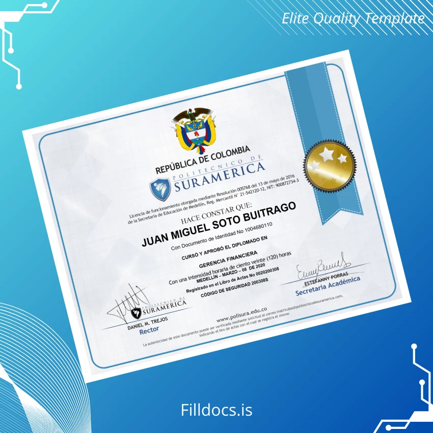 Fillable Colombia Politecnico de Suramerica Diploma in Financial Management Template – Word/PDF for easy, professional editing and print-ready certificates.