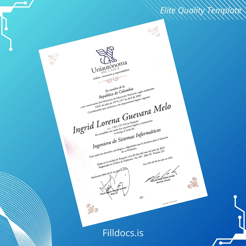Discover the Colombia Uniautónoma del Cauca Engineer of Information Systems Diploma Template – Word/PDF, a fillable and customizable digital certificate designed for professionals needing a polished and authentic diploma replacement or novelty design. This user-friendly template allows seamless editing of essential document details, making it ideal for those who require a quick and professional diploma solution.