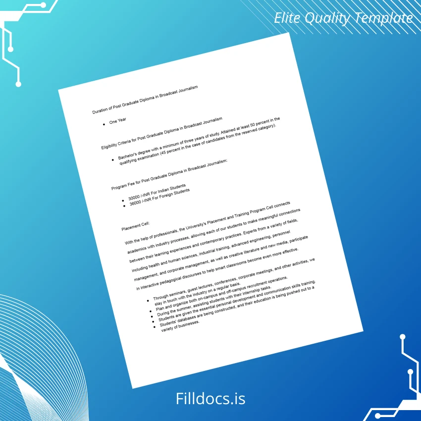 Discover the India NIMS University Post Graduate Diploma in Broadcast Journalism Template – Word/PDF, a meticulously designed digital certificate template that offers flexibility and professionalism in one ready-to-use file. Perfect for institutions or individuals seeking a reliable solution to produce authentic-looking diplomas, this editable template combines ease of customization with superior print quality to meet your official document needs.