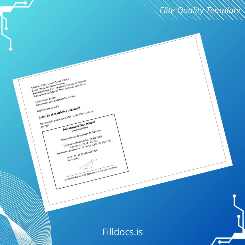 Discover the high-quality Brazil Anhanguera University Technologist in Industrial Mechatronics Diploma Template – Word/PDF, designed for professionals who need a fillable, customizable diploma form. This expertly crafted template offers a seamless solution for quickly replacing or updating diplomas while maintaining a professional and polished appearance.