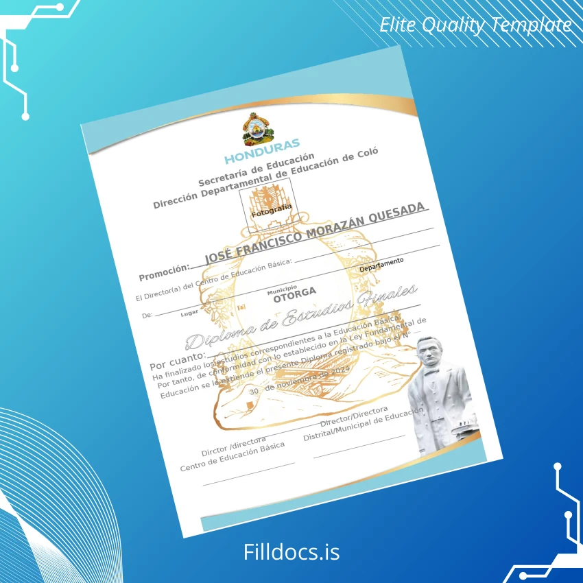 This template serves as a blank diploma form specifically crafted for the Honduras Centro de Educación Básica education system, offering a novel diploma design in digital format. It is a replacement diploma template perfect for those seeking a legally styled yet customizable degree certificate. This product is available as an instant digital diploma download, giving users immediate access to a Word and PDF formatted file ready for editing and printing.