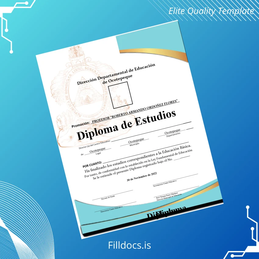 Discover the Honduras Centro Educativo de Ocotepeque Basic Education Diploma Template – Word/PDF, a versatile and professional-grade fillable diploma design crafted for seamless customization and efficient document replacement. This ready-made diploma certificate template is ideal for educators, administrators, and individuals seeking a reliable and editable diploma form that aligns with official standards.