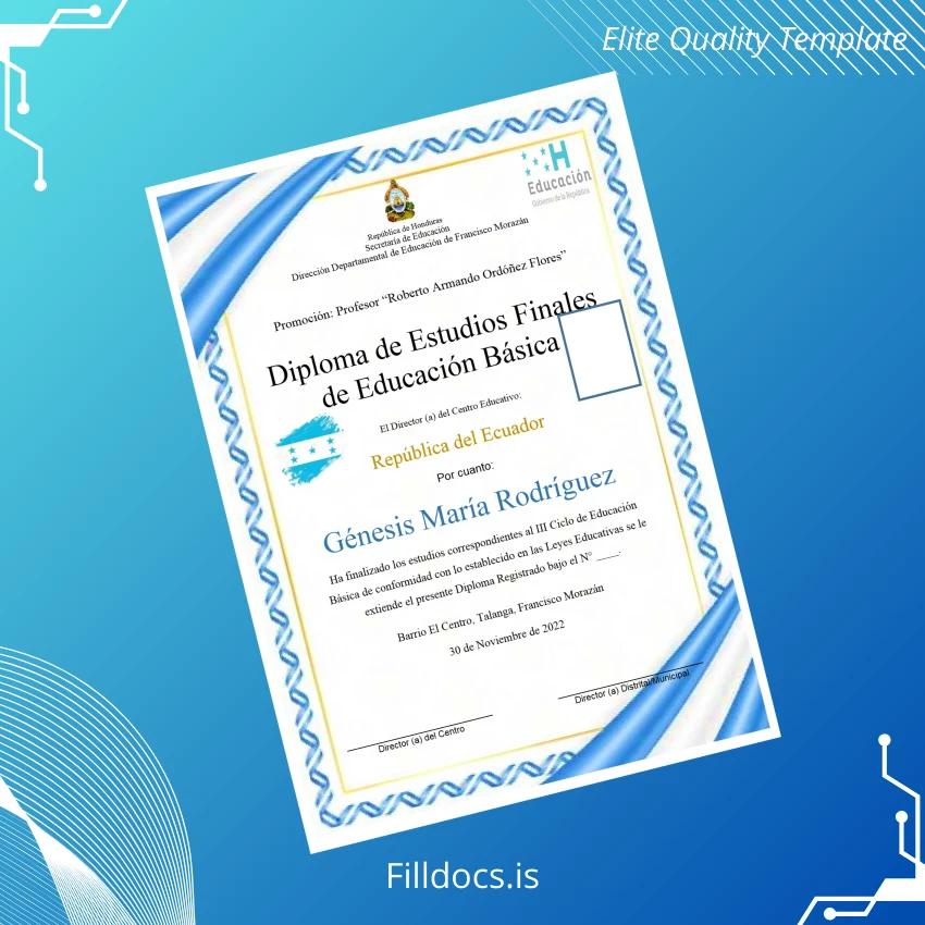 Discover the Honduras Dirección Departamental de Educación de Francisco Morazán Basic Education Diploma Template – Word/PDF, a versatile and professionally designed fillable document tailored for educators, administrators, and institutions seeking a seamless and customizable diploma solution. This editable diploma template offers a streamlined alternative for generating official certificates that meet high standards of presentation and authenticity.