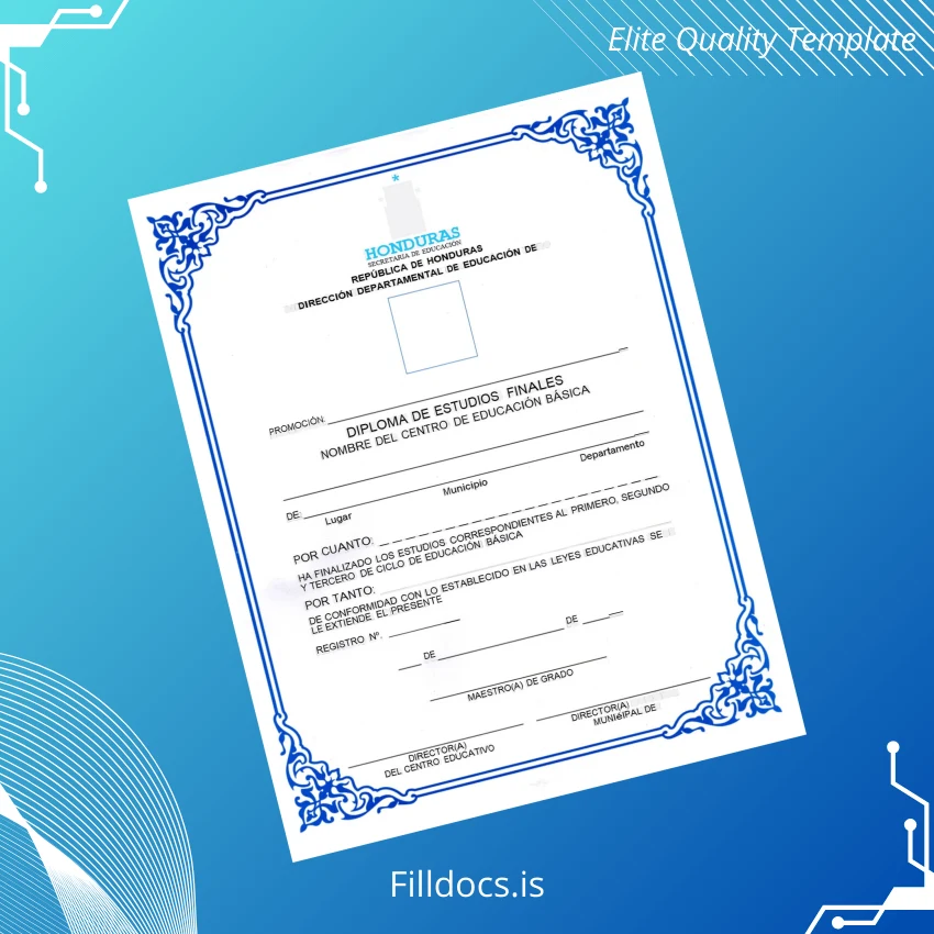 Discover the Honduras Secretaría de Educación Ninth Grade Diploma Template – Word/PDF, a meticulously crafted digital document designed for quick customization and professional results. This fillable template simplifies the creation of official-looking diplomas ensuring accuracy and elegance for academic achievements.