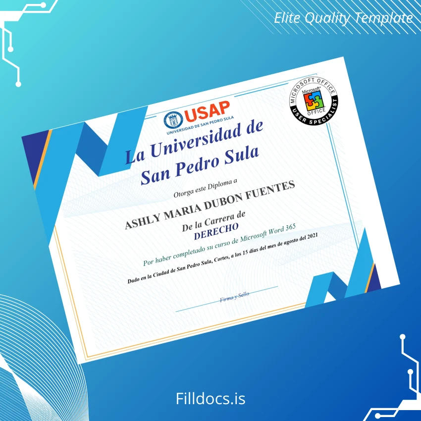 The Honduras Universidad de San Pedro Sula Diploma in Microsoft Word 365 in Law Template – Word/PDF is a professionally designed, fillable diploma certificate template ideal for legal professionals and institutions. This digital diploma download offers a customizable degree template that allows users to personalize every detail easily, ensuring an authentic and official presentation for academic or professional recognition.
