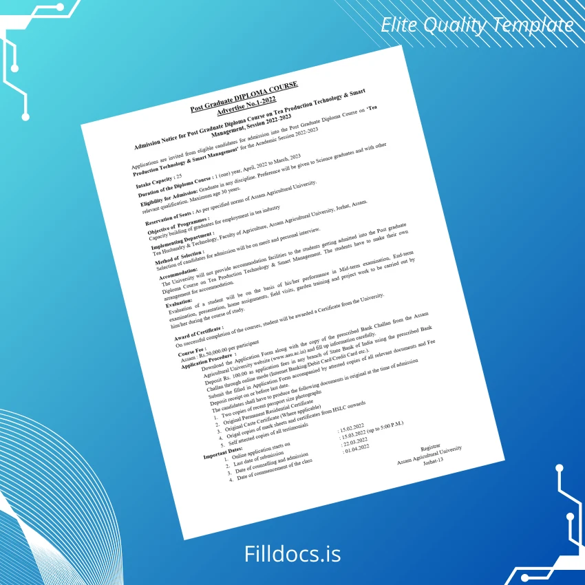 Discover the India Assam Agricultural University Post Graduate Diploma in Tea Production Technology & Smart Management Template – Word/PDF, a professionally designed, fillable diploma certificate tailored for academic and administrative needs. This editable template offers a seamless solution for individuals and institutions requiring a clean, sophisticated diploma that can be customized quickly to match official records.