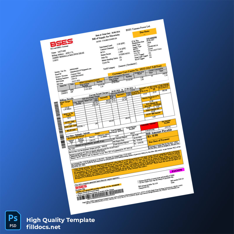 India BSES Yamuna Power Ltd Editable Utility Bill Template in Word and PDF Formats
