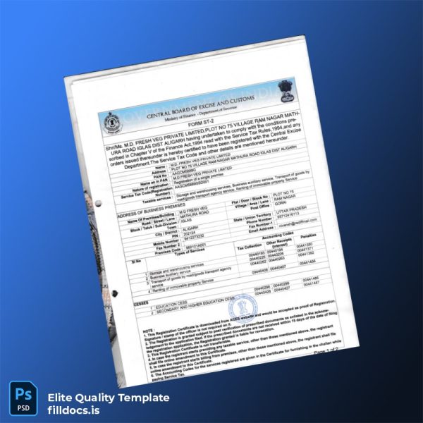 The India Central Board of Excise and Customs Service Tax Registration Certificate Template – Word/PDF offers professionals a reliable and editable document solution designed to simplify the reissuance or creation of service tax registration certificates. Ideal for accountants, business consultants, and company executives, this template enables quick customization and professional presentation in both Word and PDF formats.