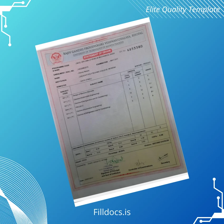 The India Government Polytechnic College Morena Diploma in Mechanical Engineering Template – Word/PDF is a high-quality, customizable digital diploma designed to meet professional standards. This fillable template allows graduates, educational institutions, and document replacement services to easily create official-looking diplomas with precise personal and academic information.