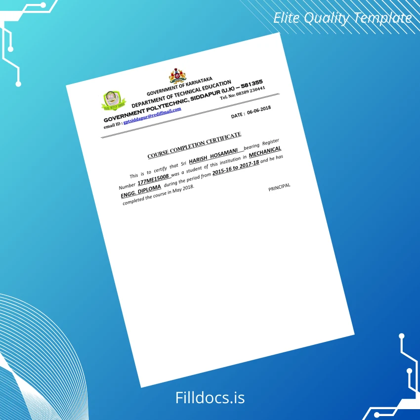 The India Government Polytechnic Siddapur Mechanical Engineering Diploma Template – Word/PDF is a professional, fillable certificate template designed specifically for mechanical engineering diplomas issued by India Government Polytechnic Siddapur. This editable template allows graduates, educational institutions, and professionals to quickly customize and generate a high-quality replica or replacement for official diploma documents with ease and precision.