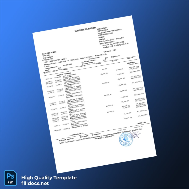 The India Indian Bank Bank Statement Template offers a seamless solution for professionals needing quick access to reliable documentation. Whether you’ve lost your original bank statement or need an updated version for verification, this editable template in both Word and PDF formats is designed to meet your urgent needs.