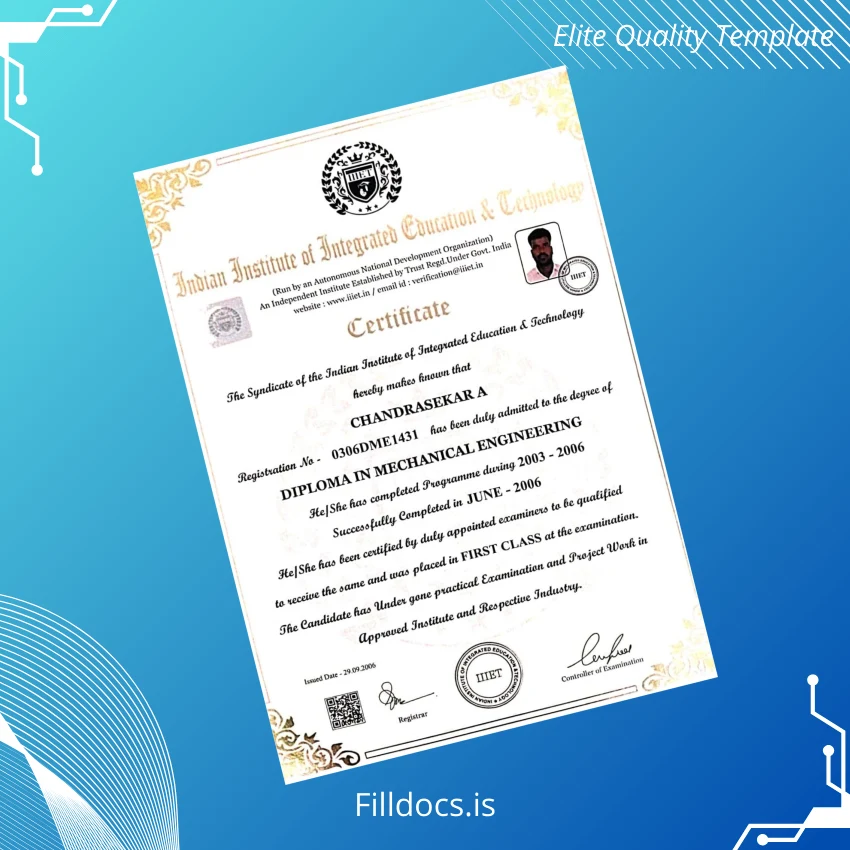 This template is a fully editable and customizable diploma certificate for the India Indian Institute of Integrated Education & Technology’s Mechanical Engineering program. It offers a blank diploma form that users can personalize with details such as names, dates, and course specifics. Created to serve as a replacement diploma template or for novelty diploma design purposes, it integrates seamlessly with digital diploma download workflows.