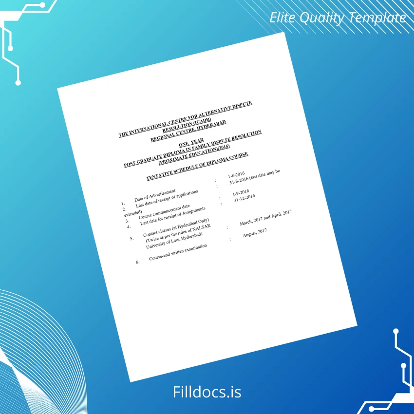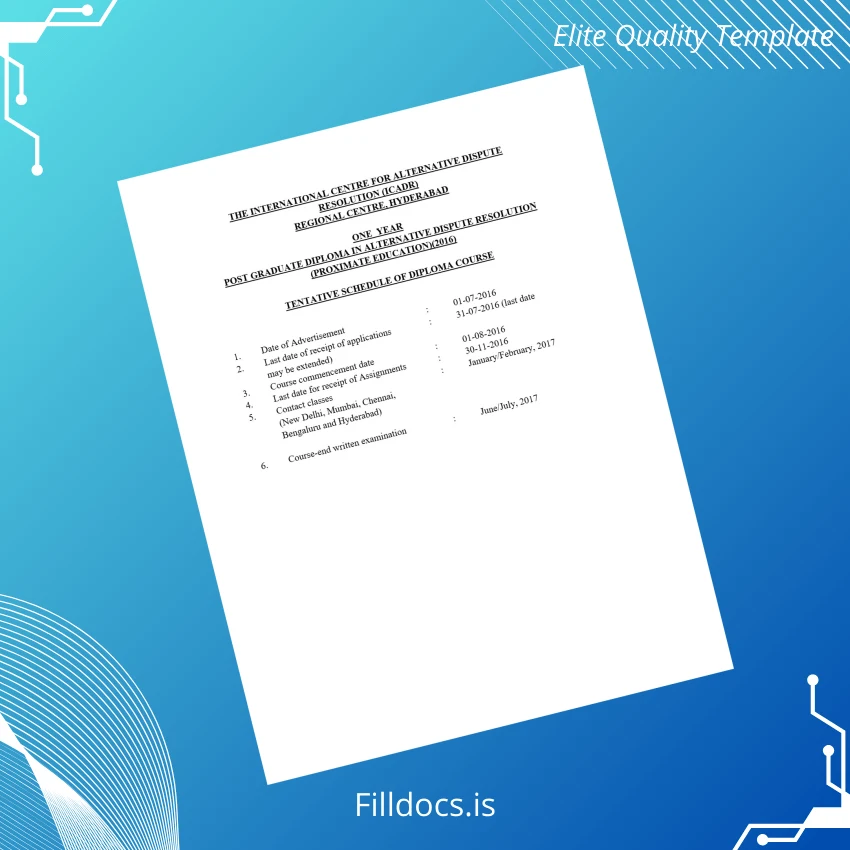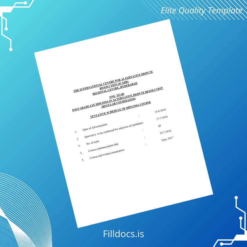 Discover the India International Centre for Alternative Dispute Resolution Post Graduate Diploma in Alternative Dispute Resolution Template – Word/PDF, a meticulously designed digital certificate template crafted for professionals seeking a customizable and fillable diploma form. This versatile file format allows easy personalization of all certificate details, making it an ideal solution for individuals requiring a replacement diploma template or a novelty diploma design with professional quality.