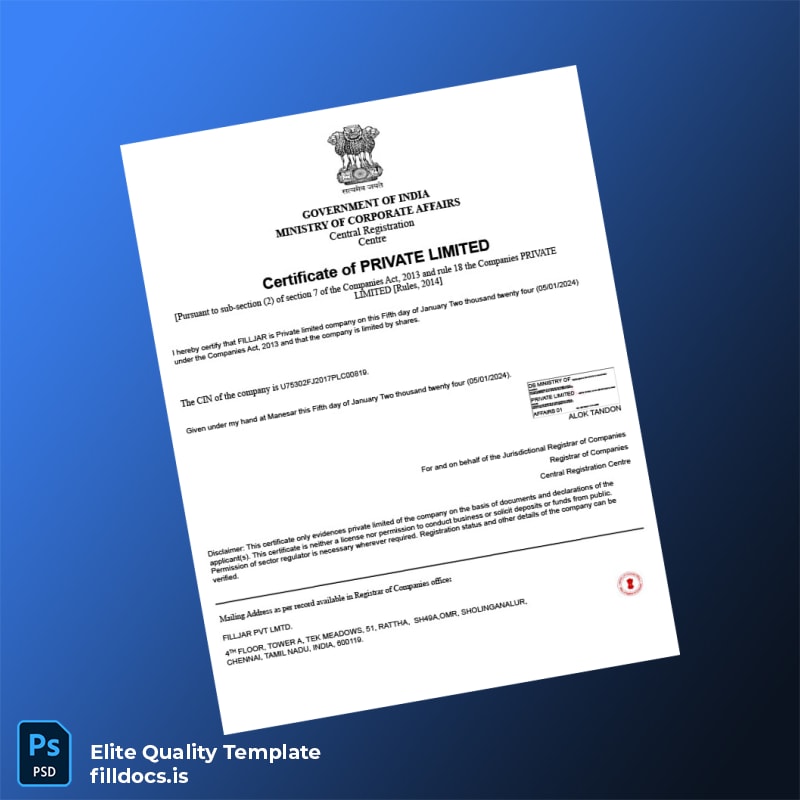 India Ministry of Corporate Affairs Certificate of Incorporation Template – Word/PDF