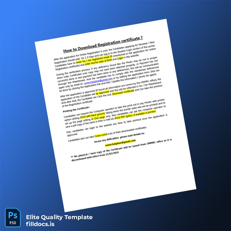The India ONMRC Registration Certificate Template – Word/PDF is an essential tool for professionals seeking a convenient and reliable solution to recreate or replace their official registration documents. This editable registration certificate template is designed to save valuable time and resources by allowing users to customize and print a professional-grade certificate with ease.