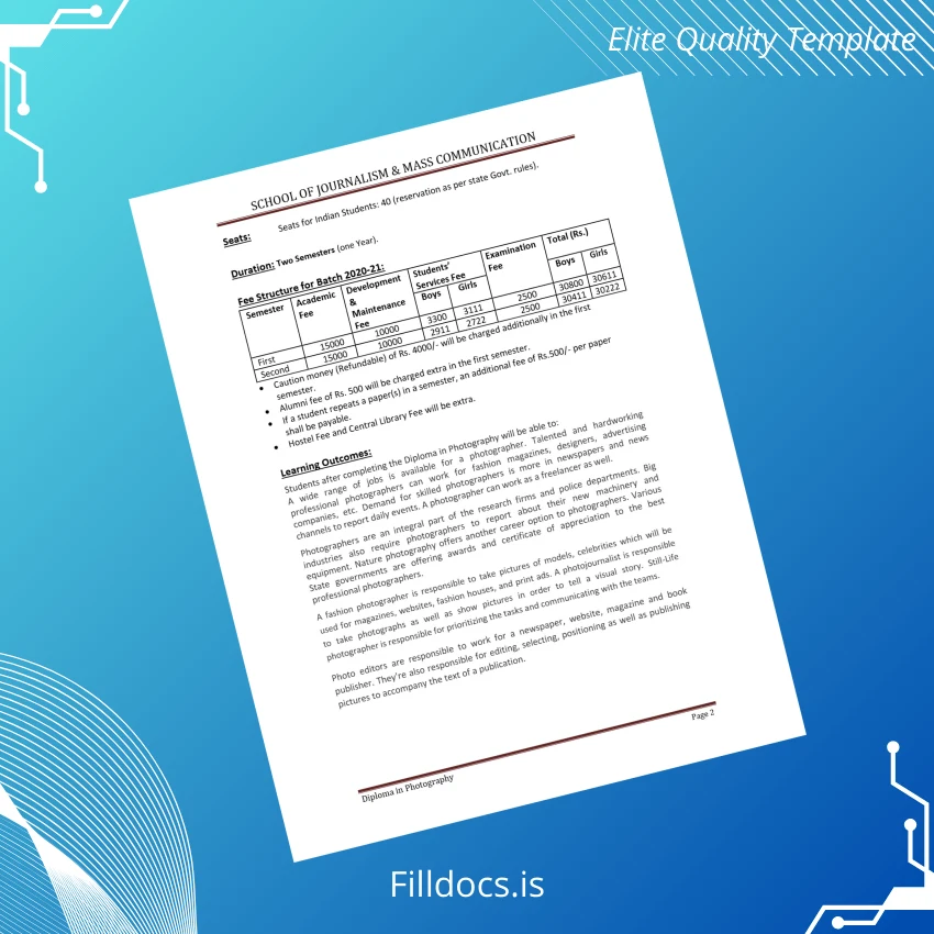 Discover the India School of Journalism & Mass Communication Diploma in Photography Template – Word/PDF, a professional, fillable diploma certificate template designed for effortless customization and high-quality output. Perfectly suited for educators, administrators, and printing specialists, this digital diploma download serves as an essential asset for creating authentic replacement diplomas or novelty diploma designs with ease.
